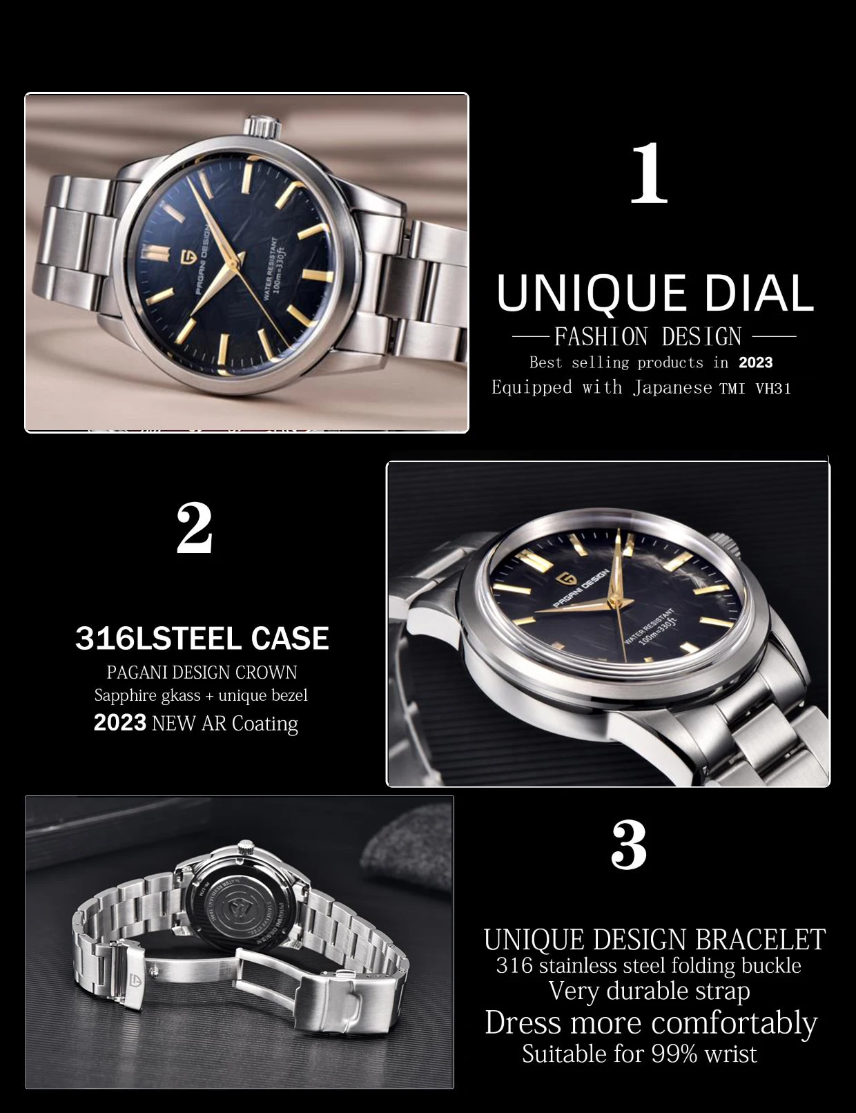 40MM Men Quartz Watches TMI VH31 Luxury Business Top Sapphire 316L Stainless Steel 100M Waterproof Watch for Men